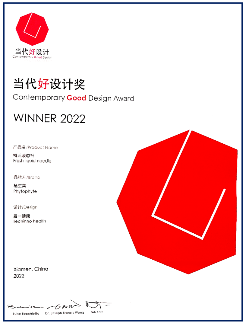 This award is for the appearance design of fresh liquid needle (Patent No. : ZL 2022 3 0131908.1) is highly recognized as a breakthrough in the industry's conventional use of packaging, liquid needle with a minimalist appearance design, the use of medical beauty needle concept, through the injection of nitrogen, to achieve the role of isolating air, can keep the original liquid fresh, extend the product life. The innovative design realizes the cross-border integration of beauty and food sources, meets the diversified consumption needs of high-end consumers, and also promotes the development of oral beauty market in the new consumption era.