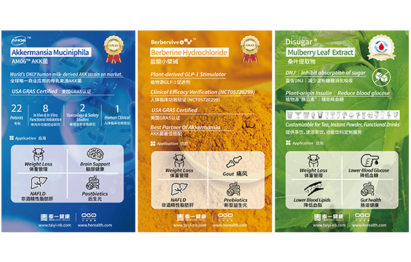2025年功能性原料市场呈现爆发式增长,泰一健康围绕健康消费市场的核心需求,重点布局了睡眠情绪(PanaReishi®灵芝提取物、西蓝花提取物)、体重血糖(MitolgniteTM黑姜提取物、荷叶提取物)、消化健康(GastGud®猴头菇提取物、BioCurMax®包埋姜黄提取物)、口服美容(TiRoxC®刺梨提取物、StanYouth®尿石素A)、抗衰延寿(NADH、黄栌提取物)等热门方向的优质原料,精准捕捉现代人群在细分健康领域的痛点。并推出的年度战略新品AM06TMAKK 菌与BerberviveTM 盐酸小檗碱,进一步强化了产品矩阵的创新性与竞争力,满足市场前瞻性布局。