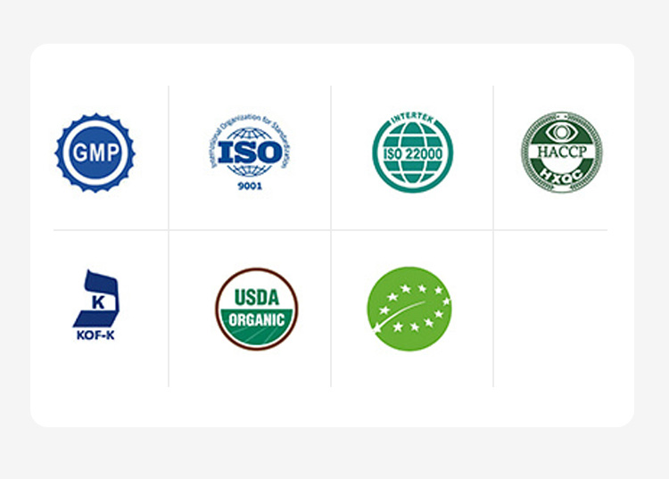 为确保产品的合法合规性和质量可靠性,我们建立了完善的质量保证体系,严格把控产品生产、质量检测、售后服务等全过程。现已拥有包括GMP认证、ISO9001、ISO22000、HACCP、Kosher等证书,通过欧盟、美国、英国、澳洲、中国等多个国家的权威认证,能为客户的全球化战略提供优质的产品解决方案。